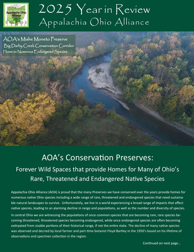 Annual Dinner and Friends Gathering, December 6, 2025. Approximately 125 people attended AOA’s Annual Dinner and Friends Gathering at The Mill in Lancaster Ohio. The theme of the dinner was AOA’s Conservation Preserves, Forever Wild Spaces That Provide Homes for Ohio’s Threatened and Endangered Species. Our guest speaker was Rob Curtis, Ecologist and Field Biologist. AOA staff provided a conservation update on 10 new properties that were acquired or are pending acquisition in 2025. A highlight of the evening was the presentation of a Conservation Award to Paul and Kathy Knoop.