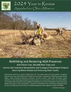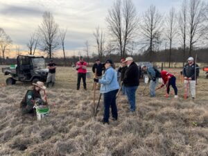 March 19, 2025, AOA’s Poston Preserve. Approximately 60-75 volunteers planted 1,200 native deciduous trees of 12 species as part of the land restoration plan for Poston Preserve in Morrow County. This tree planting event drew FirstEnergy staff and Green Team volunteers, DNO Produce employees and managers, AOA staff and board members, Central Ohio Chapter of the Isaac Walton League members, Ohio Certified Volunteer Naturalists, friends, relatives, and neighbors. AOA staff trained volunteers to plant trees and install protective tubes around each tree.